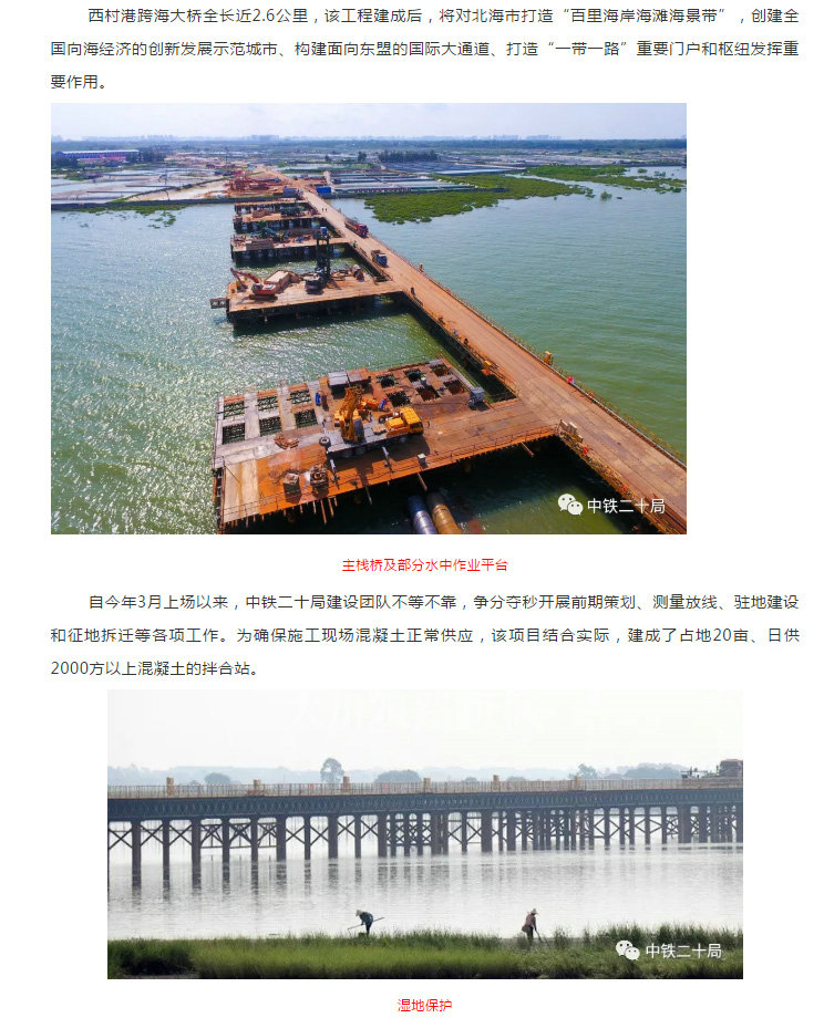 該工程緊鄰北海銀灘東區(qū)海濱濕地公園,棲息著蒼鷺、剪尾、招潮蟹、海桑、鹵蕨等數(shù)十種動植物,生態(tài)保護(hù)壓力巨大。中鐵二十局建設(shè)者在施工中全面推行工地除塵、棧橋降溫、濕地防護(hù)等保護(hù)措施,精心做好生態(tài)保護(hù)工作。